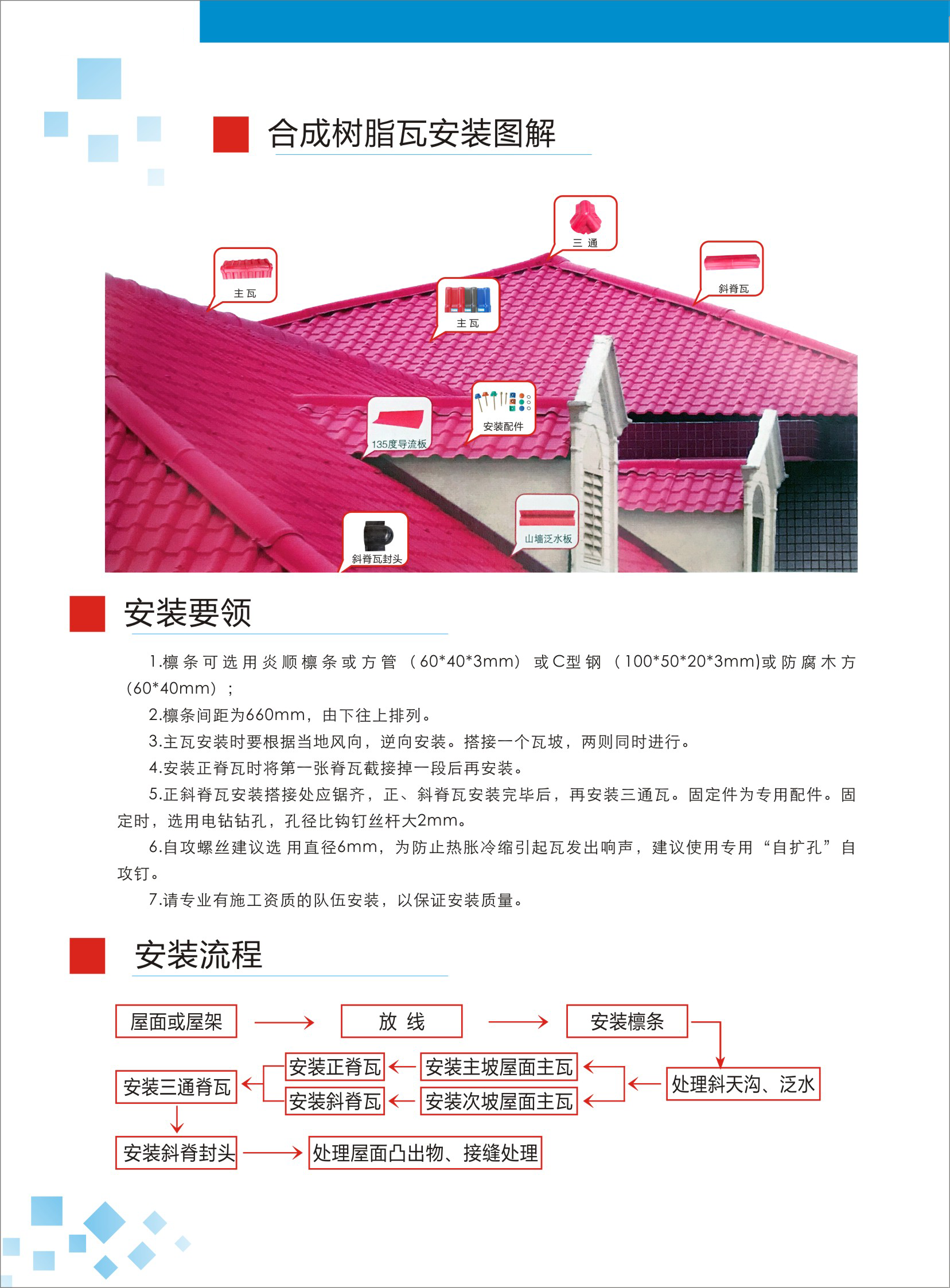 產(chǎn)品使用范圍: 平改坡、別墅、移動(dòng)房屋、園林樓閣、山莊、仿古建筑、新城鎮(zhèn)改造、樓盤工程等屋面領(lǐng)域
