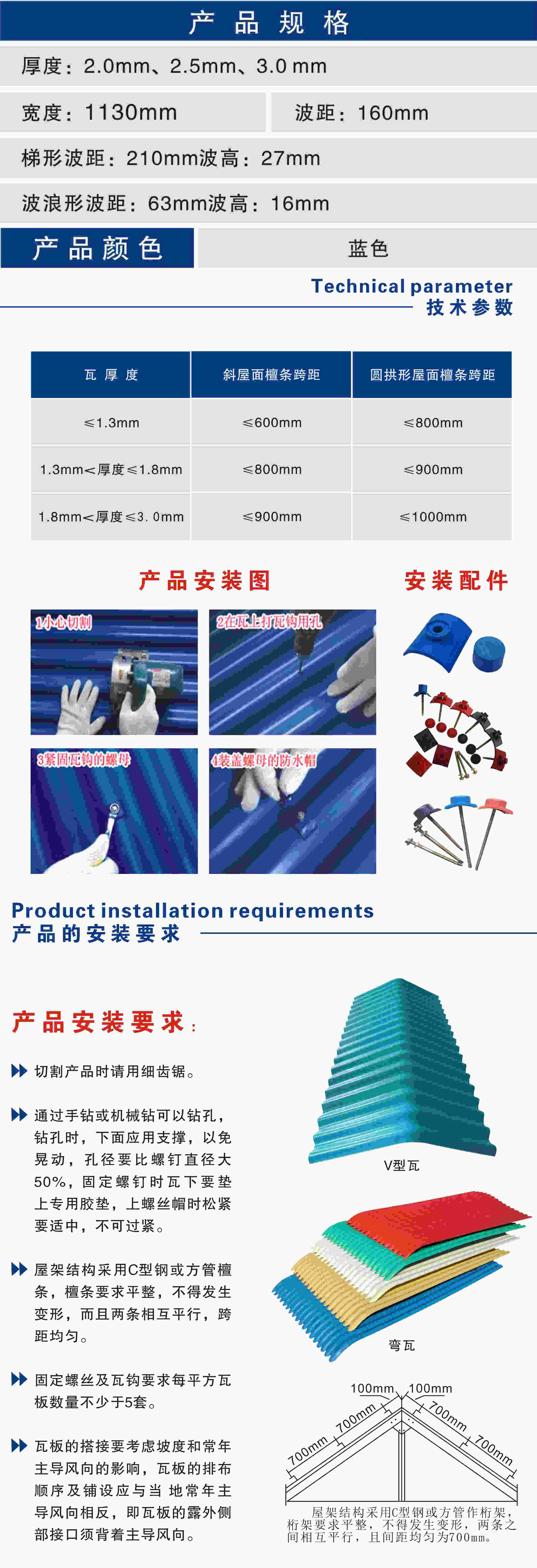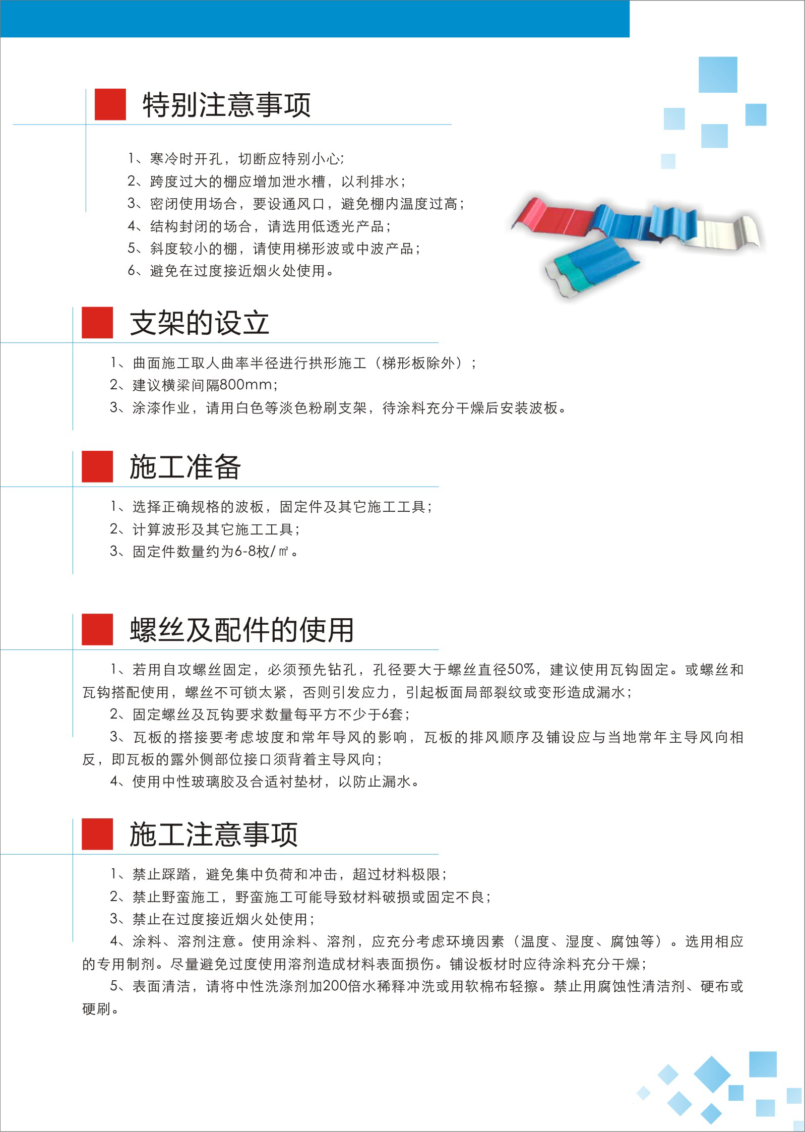 產(chǎn)品使用范圍:廠房、鋼結(jié)構(gòu)、倉(cāng)庫(kù)、農(nóng)貿(mào)市場(chǎng)、市場(chǎng)通道、車(chē)棚等高檔屋面材料。尤其在有腐蝕性的化工廠、冶煉廠、印刷廠、陶瓷廠、化肥等有腐蝕性的工廠使用,效果特別顯著。
